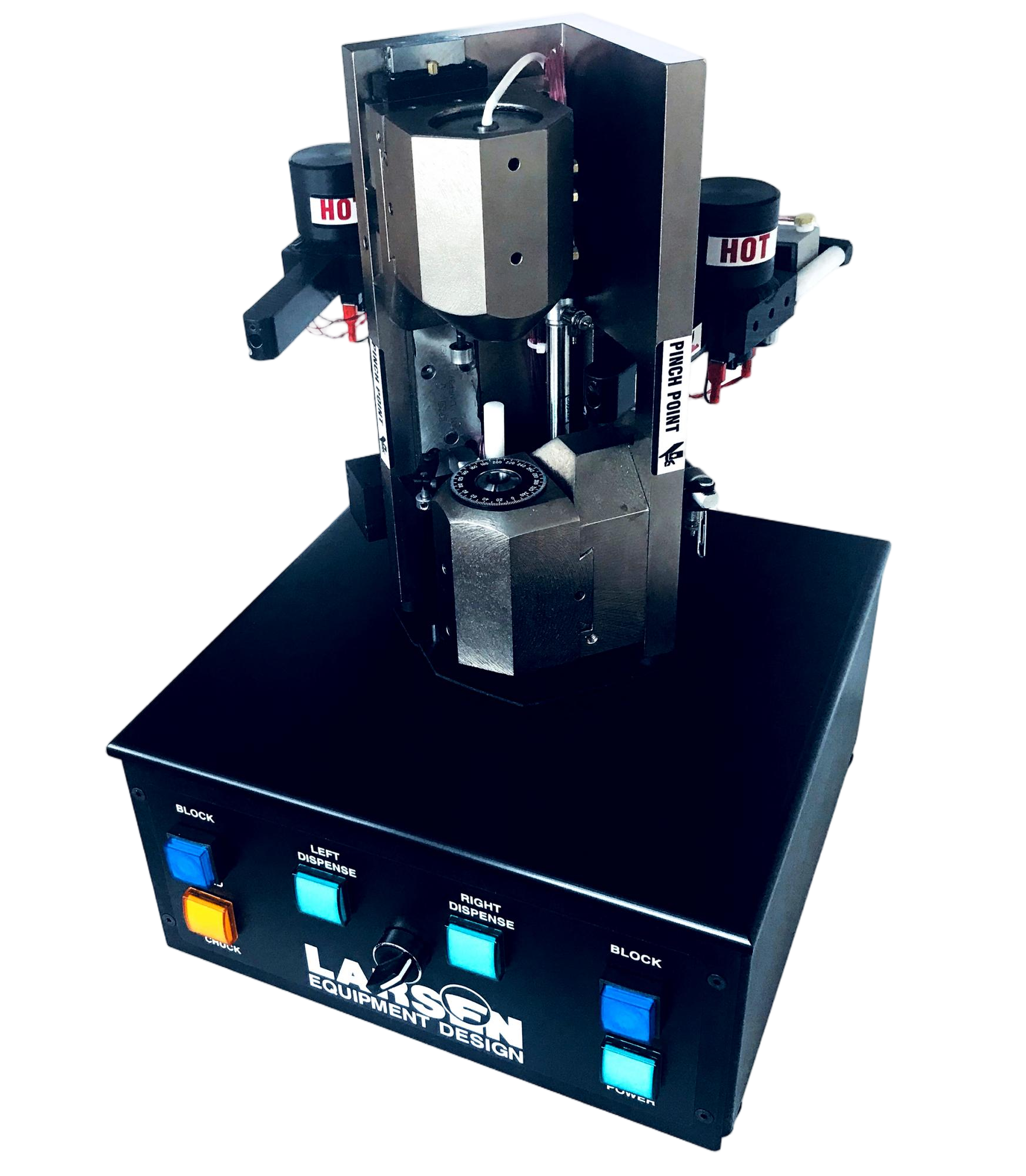 Have you ever had the need for using multiple wax types and been frustrated with constantly switching dispensers? All of that ends here, with the Larsen Dual Dispenser Auto Blocker. With the flip of a switch, you can choose which wax you want to dispense within the cycle. Each dispenser has its own temperature controller for differing wax melting points. You can even add a multi-shot switch in case you need more than one pump of wax! This machine can be configured with either wax thickness control option.