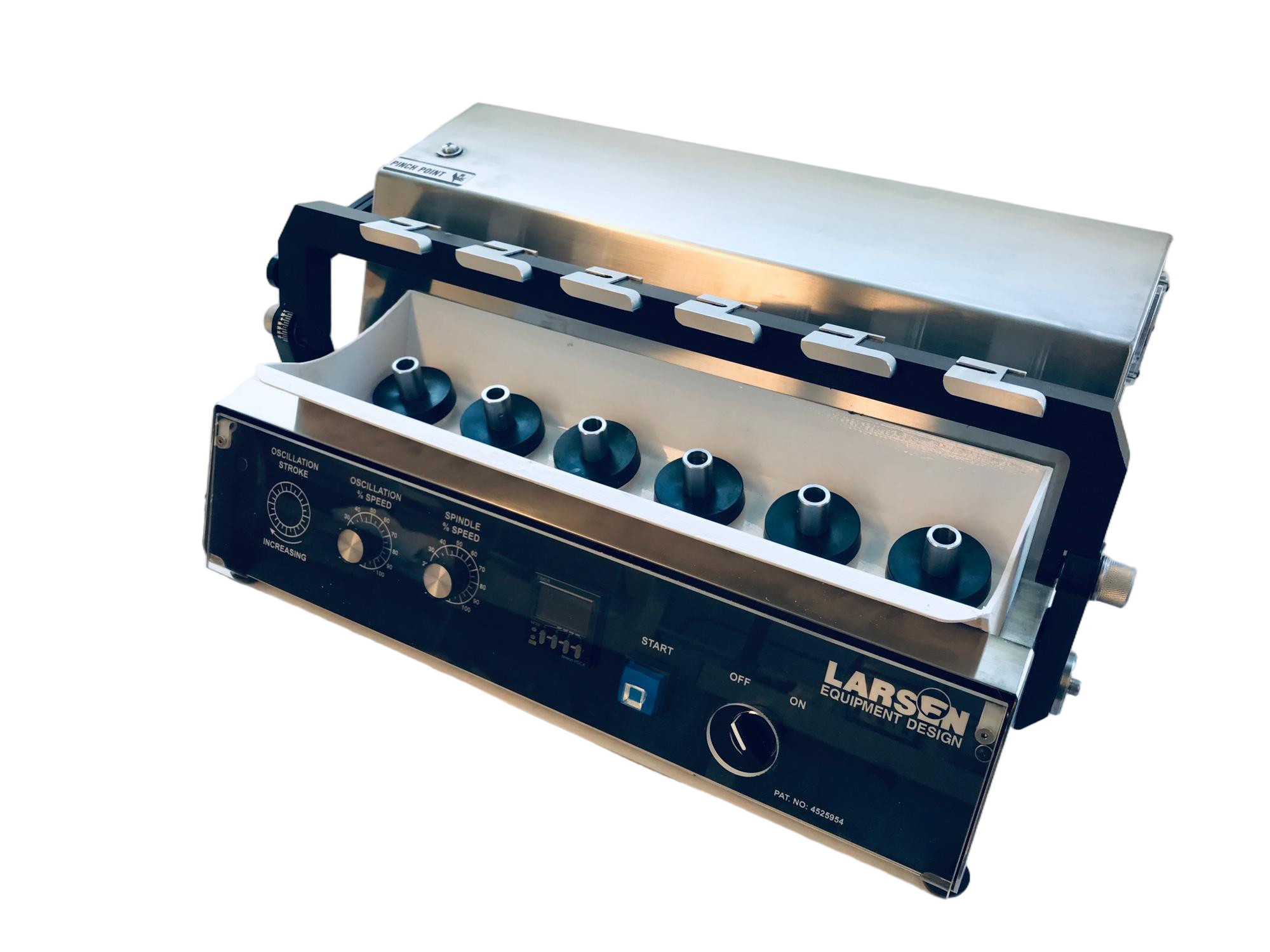 Larsen’s “Bridge Technology” automatically compensates for tooling variations, eliminates pin adjustments. If you are polishing many of the same lens then the 2 or 6 spindle radial arm polisher is for you! Once you set up one of the spindles, all the rest are exactly the same so you can be confident in getting consistent results. All units are made of stainless steel housings, anodized aluminum struts and high end mechanical and electronic components to guarantee maximum output and longevity.